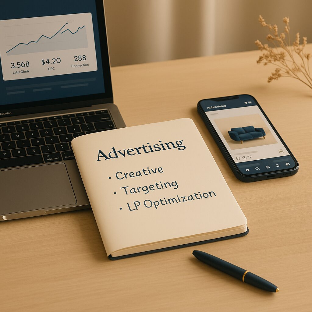 Meta・Google・P-Maxなどの媒体特性を踏まえ、クリエイティブ制作・ターゲティング・LP改善まで一貫して最適化。